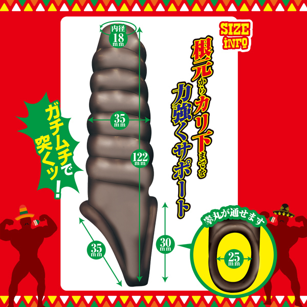 仕様:パッケージ:16.5×5.0×5.0cm 本体:全長12.2cm・最大径3.5cm・亀頭露出穴内径1.8cm・睾丸装着穴内径2.5cm