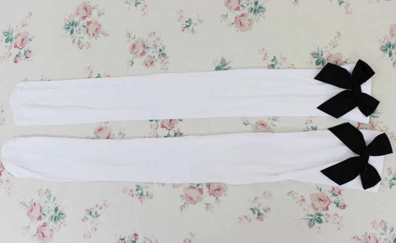 ●薄手の白いニーハイソックス●履き口に大きな黒リボンをON●足元をエレガントに彩るシンプルなコスプレ小物●かかとの縫製がないので前後どちらでも着用できます。