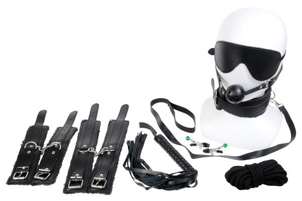 セット内容:リード付き首枷、手枷、足枷、アイマスク、口枷、乳首クリップ、SMロープ、バラムチ