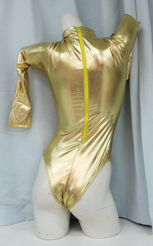 ハイレグからむっちりはみ出るお尻と脚がたまらなく際立つ、ゴールドカラーの長袖ハイネックレオタード。