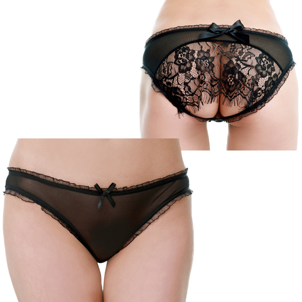 ブラックのシースルー生地をベースに、フリルを使ったトリミングやリボンの装飾がカワイイ感じを演出してくれるフルバックタイプのショーツで、フロントとバックの印象が大きく違う二面性が楽しめます♪大きくラウンドカットされたヒップサイドには大きめなサテンリボンと、優雅なフローラルレースで装飾され、かなり大胆なデザインになっています!